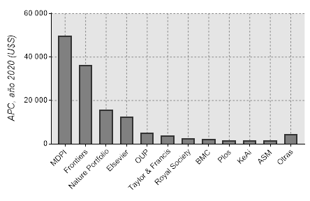 Para la estimación del valor promedio de APC por artículo, se utilizó el valor promedio suministrado por la base de datos Open APC (www.treemaps.openapc.net) al día 13 de octubre de 2021 (1930 euros, correspondientes a 2237 dólares). Esta base de datos se construye sobre la información suministrada voluntariamente por las bibliotecas de distintas universidades e institutos de investigación. Debe considerarse que a la fecha aportan información a esta base de datos únicamente 318 instituciones europeas y siete norteamericanas, sin participación de Sudamérica. Por tanto, se realizó un segundo cálculo más conservador, ajustando a la baja este parámetro (asumiendo un valor arbitrario de USD 1500 por artículo).