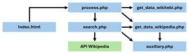 El componente «index.html» actúa como la vista principal y punto de entrada, interactuando con «process.php», que maneja la lógica del negocio y el flujo de trabajo, y vinculándose con «search.php», «get_data_wikipedia.php», «get_data_wikitebi.php» e indirectamente con «auxiliary.php». En tanto, «get_data_wikipedia.php», «get_data_wikitebi.php» y «auxiliary.php» se encargan de obtener marcadores, información y realizar cálculos. Por su parte, «search.php» conecta con la API de Wikipedia, implementando consultas y procesando respuestas, por lo que cumple los roles de modelo y vista de resultados. La API de Wikipedia es un componente externo invocado para obtener datos.