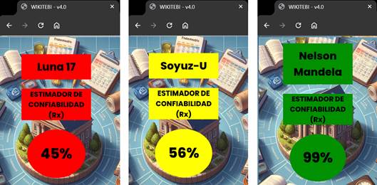 Los datos y valores de los indicadores de confiabilidad se presentan de manera que también sean útiles para evaluar la calidad del contenido de Wikipedia. Dado que la aplicación está dirigida a niños, el nivel de confiabilidad debe ser fácilmente identificable usando colores como un semáforo (verde, amarillo, rojo), lo que se refleja en la interfaz de resultados (ver ilustración 2).