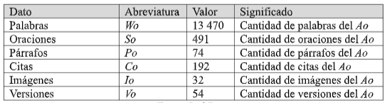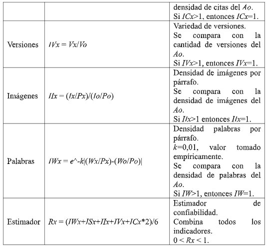 De esta manera, los indicadores de confiabilidad para un artículo x, que tiene Px párrafos, Cx citas, Sx oraciones, Vx versiones, Wx palabras e Ix imágenes -y considerando el Ao (artículo ideal con el cual se compara el artículo x) que tiene Po párrafos, Co citas, So oraciones, Vo versiones, Wo palabras e Io imágenes- se pueden calcular como se muestra en el cuadro 2.