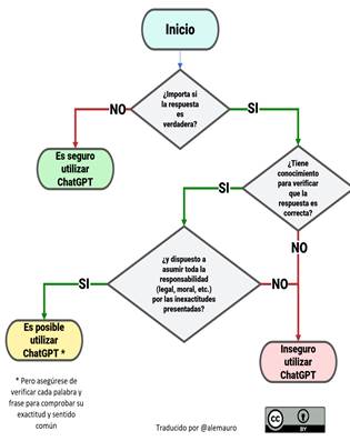 En el contexto de la educación superior, que se caracteriza por generar conocimiento de alta calidad que contribuye al avance científico en las distintas disciplinas, surge la interrogante sobre cuándo es apropiado el uso de la inteligencia artificial. Es esencial considerar este aspecto para evitar que posibles imprecisiones en las respuestas comprometan la calidad de la información o induzcan errores. En la figura 1, se puede apreciar un diagrama de flujo que contribuye a dar respuesta a dicho cuestionamiento.