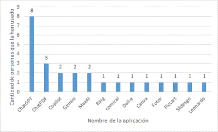En relación con lo anterior, la herramienta más frecuentemente utilizada por las personas es ChatGPT -de la empresa OpenAI-; en segundo lugar, ChatPDF, y el tercero en frecuencia de uso es Copilot, tal y como lo muestra la figura 2.