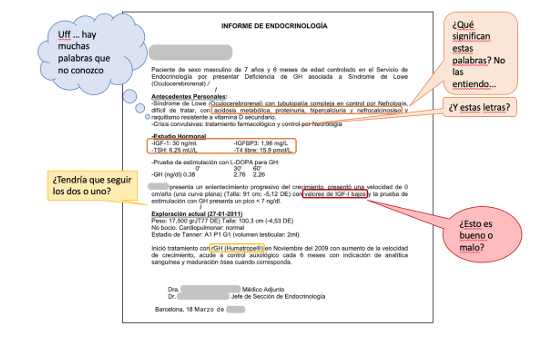 El paciente quiere entender qué tiene y qué debe hacer; el diagnóstico y el tratamiento o las pautas a seguir son los aspectos más importantes que un paciente debe comprender para que colabore y se adhiera al tratamiento de manera positiva (Galán-Rodas y Zamora, 2015). No obstante, los informes que hablan de un paciente único y que son de ese paciente, parecen no estar pensados para que los entienda. Por ejemplo, en una comunicación con una paciente de 82 a la que se le había realizado una colonoscopia y una endoscopia, la médica le dijo, en medio minuto y todavía bajo los efectos de la anestesia, que todo estaba bien, excepto que un pequeño capilar sangraba un poco y que se lo habían quemado para que no sangrase más. Seguramente, a partir de ahora empezaría a recuperarse de la anemia porque este capilar podría ser la causa del leve sangrado. El resto todo normal. También le dijo que cuando se despertara del todo se vistiera y podría marcharse en el momento en que le entregaran el informe. Y la médica se fue diciendo que se iba a redactar el informe. A pesar de lo rápido, seco y frío del mensaje oral, sin ninguna posibilidad de preguntar, la paciente estaba contenta porque había entendido que no tenía ninguna célula cancerígena y que solo una pequeña vena sangraba y se la habían quemado para que dejara de hacerlo. Al cabo de unos minutos, la enfermera le entregó el informe de la médica en un sobre cerrado. La paciente lo abrió y dijo «menos mal que me ha dicho que no tenía nada», porque el diagnóstico ponía «angiodisplasia cecal», que la paciente entendía que era algo malo. Y en el procedimiento, leyó: «Se detecta una angiodisplasia cecal que se fulgura. Resto del colon sin lesiones con mucosa preservada». Nada tiene que ver, aparentemente, en la mente de la paciente, angiodisplasia con capilar que sangra ni quemar con fulgurar. Al cabo de 15 días, la paciente regresó a su especialista y esta le dijo que suponía que estaba contenta porque no habían encontrado células cancerígenas, simplemente una variz que sangraba; eso la tranquilizó todavía más, porque le confirmó que no tenía que ver con venas que sangraban y acababan provocando un ictus, que era otro tema temido por la paciente.