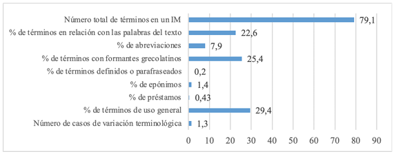 Se estimó que el porcentaje de términos por informe médico es del 22,6 %, ratio muy elevada, de acuerdo con el estudio de corpus realizado por Domènech-Bagaria (2006), en el que se analizó la densidad terminológica de varios textos con niveles de especialización distintos y de diferentes ámbitos del conocimiento. La autora observó que el porcentaje de densidad terminológica se sitúa entre el 9 % y el 21,5 % en textos jurídicos, y entre el 10 % y el 18,6 % en textos sobre genómica.