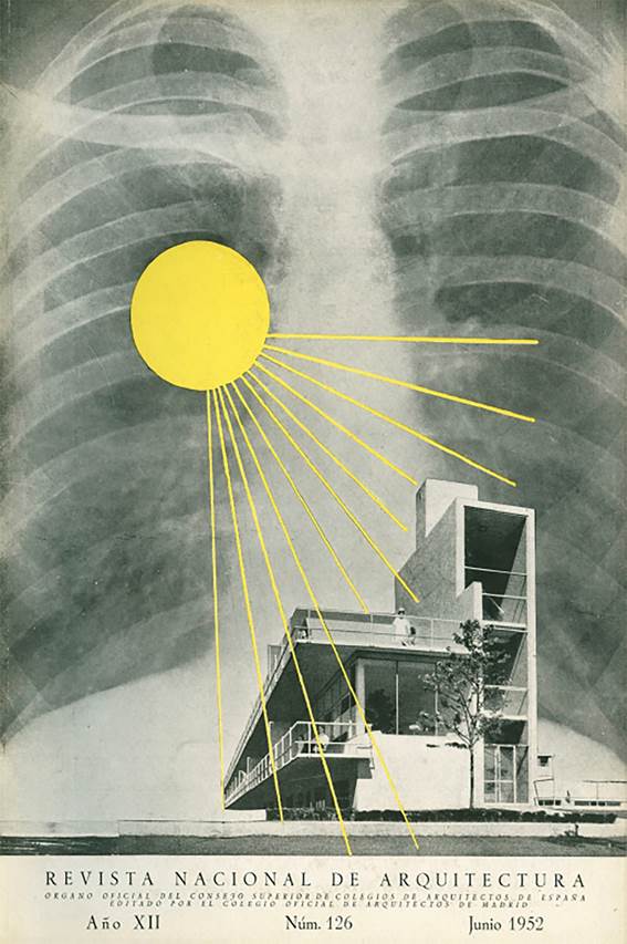 Así, el IV Congreso Internacional de Arquitectura Moderna (CIAM), celebrado a bordo del Patris II en 1933 en la ruta Marsella-Atenas-Marsella, intentaba sentar las bases de una nueva arquitectura que acabara con las condiciones insalubres de las viviendas y el espacio público, naciendo de las manos de Le Corbusier la famosa Carta de Atenas (1942). Y es que, esa preocupación histórica de la arquitectura por ir adaptándose a los tiempos se acentuó en el desarrollo del Movimiento Moderno, y como señala Beatriz Colomina, fue evolucionando de forma paralela al desarrollo de los Rayos X. Atraída por el ensayo de Susan Sontag La enfermedad y sus metáforas, de 1978, comenzó a investigar este tema ya en 1980 (Colomina, 2021, p. 7). Como explica en varios escritos, “la arquitectura de principios del XX no puede ser entendida con independencia de la tuberculosis. De hecho, los principios de la arquitectura moderna parecen haber sido sacados directamente de un libro de medicina sobre esta enfermedad (…) los pilotis, las terrazas jardín, las paredes de cristal, el aire limpio, se presentan como dispositivos médicos. Incluso las paredes son blancas para revelar cualquier posible contaminación” (Colomina, 2006, pp. 154 y 156). Esta arquitectura, que Colomina afirma derivar de la obsesión por combatir la tuberculosis, se publicaba en varios libros de la época, mostrando paralelamente la penetración de los rayos de sol en los sanatorios antituberculosos y en las terrazas domésticas modernas. (Figura 1) Dado que el contagio de la bacteria causante de la tuberculosis se produce por vía aérea y afecta a los pulmones, es inevitable trazar paralelismos con la actual situación provocada por el covid-19 y volver con interés hacia esa arquitectura que trataba de evitar su propagación.