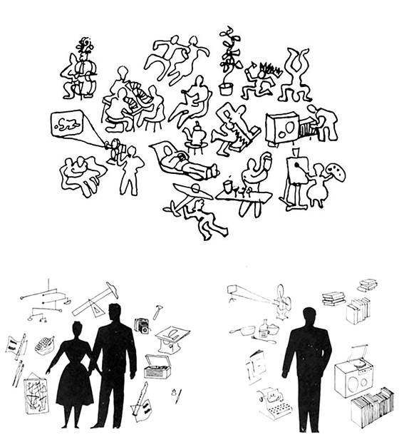 Figura 4: “What is a House”. Illustración de Charles Eames de las actividades que deberían incorporarse en el diseño de una casa (Arts & Architecture, julio, 1944) / Dibujos de Ray y Charles Eames y de John Entenza rodeados por artefactos que definían sus respectivos estilos de vida. (Arts & Architecture, diciembre, 1945)