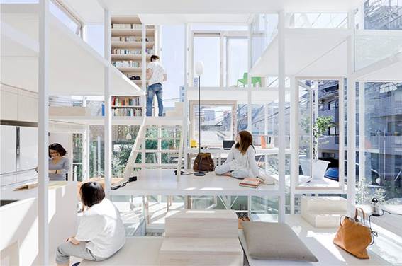 Otro paisaje doméstico de indudable dinamismo y abstracción es el que crea Sou Fujimoto en la la Casa Na (2010), una vivienda estructurada a partir de diferentes niveles estratificados que, a manera de muebles, son conectados por escaleras diáfanas o peldaños de madera, generando un verdadero raumplan contemporáneo, un espacio flexible que responde eficazmente a usos individuales y grupales. (Figura 5)