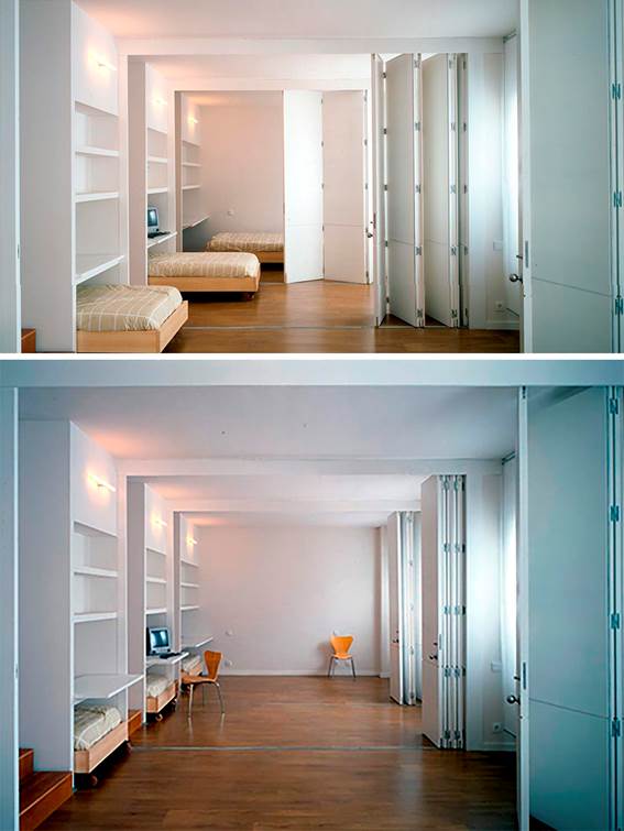 Podemos considerar también el tiempo físico atendiendo al cambio espacial de la vivienda según sea de día o de noche. La planta superior de la Schröder House (1924) siempre es inspiradora, en este sentido. El proyecto de Le Corbusier de Casa Doble para la Weissenhof de Stuttgart (1927) proponía un espacio lineal que de día se abría completamente y de noche podía compartimentarse en células-dormitorio accesibles desde un corredor lateral. De forma similar, esta dualidad temporal ha sido utilizada por Aranguren & González Gallegos en algunas de sus casas en Madrid, cuyo espacio diáfano diurno facilita desarrollar actividades diversas e improvisadas. (Figura 7) El mismo concepto se puede reflejar en el equipamiento de la casa: Joe Colombo, por ejemplo, diseñó para su propio apartamento en Milán, en 1969, dos máquinas móviles, Rotoliving y Cabriolet-Bed, que incorporaban respectivamente todo el equipamiento necesario para el uso diurno y nocturno, y podían moverse por áreas controladas dentro de la vivienda.