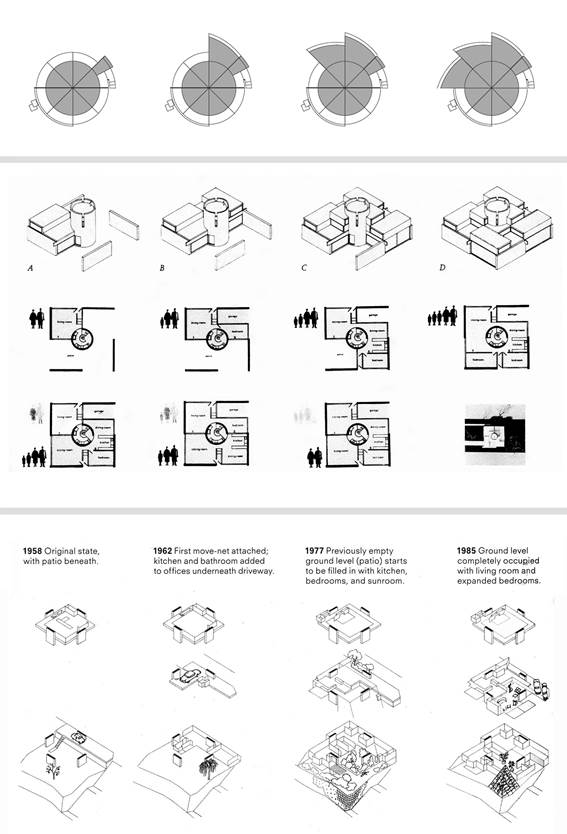 Figura 8: Capacidad de la Vivienda para adaptarse a los cambios en la famila. Esquemas de crecimiento de la Casa de plástico de Ionel Schein (1956), la Casa ampliable de James Stirling (1957) y la Casa del cielo de Kikutate (1958).