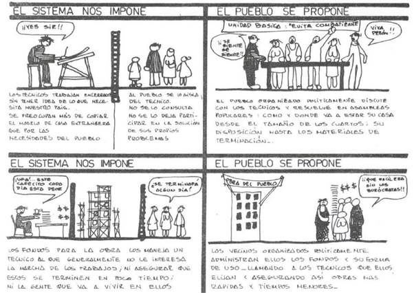 Estas ideas pueden verse aplicadas en uno de los proyectos, donde para la formulación del diagnóstico, previo a la formulación de un plan de viviendas, se propuso la conformación de un equipo de trabajo donde participaron los técnicos, los representantes de las instituciones estatales, representantes de las organizaciones populares y delegados de los vecinos. Este equipo, capacitación mediante de todos sus integrantes, fue el encargado de construir los instrumentos del diagnóstico, su desarrollo y evaluación posterior (IIP, 1974:10). Estos mecanismos dan cuenta de una idea de participación distinta a la que se venía construyendo por las políticas de vivienda de la época. En contraste con una participación mayormente consultiva e individual, la propuesta apuntaba a una participación integral, entendida como un derecho, colectiva y en todas las instancias del desarrollo de las respuestas habitacionales.