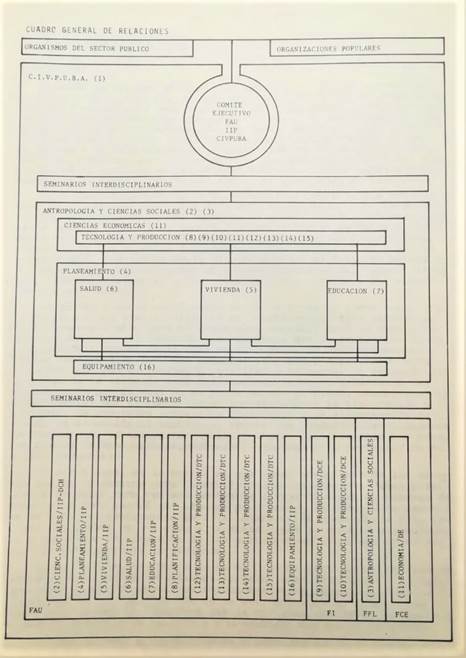 La interdisciplina estructuraba la propuesta, formulando el Programa como parte de la política de la Universidad. En este sentido, se propuso la confluencia de esfuerzos realizados por Institutos, Centros y Departamentos de diversas facultades de la UBA, y se invitó a participar a las facultades de economía, ingeniería y humanidades. En la formulación de sus proyectos y estructura organizacional pueden verse todos estos elementos que se comentaban (Figura 5 ). Además, se generaron diversas instancias y formas de vinculación con organizaciones políticas y el movimiento villero, lo cual se visualizó en la organización del Primer Congreso Nacional de Vivienda Popular realizado en diciembre de 1973, en la UBA, donde el IIP fue un actor destacado en las discusiones. En los proyectos del Programa es posible reconocer las diferentes formas de articulación con gobiernos municipales, con organizaciones sociales, con cátedras y otras facultades.