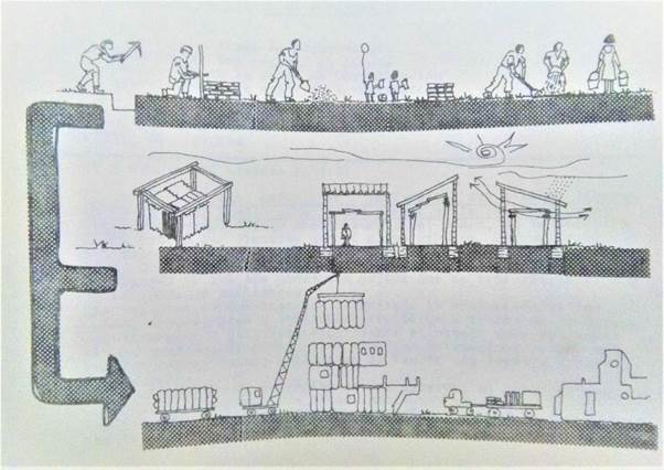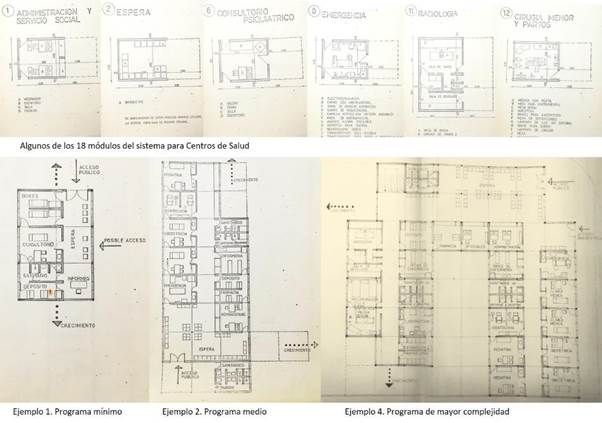 Las propuestas del IIP incorporaron la perspectiva de la masividad y sistematicidad para el problema de la vivienda, en sintonía con los desarrollos previos de sus impulsores. Estas ideas se ven, por ejemplo, en un proyecto de sistema de centros de salud, donde se generó una metodología sistemática que permitía resolver diversos programas, desde una unidad mínima de atención hasta la máxima complejidad. A la vez, se proyectó un esquema flexible, que podía crecer, ubicarse en diversas locaciones y que contemplaba la participación popular organizada (Figura 8).
