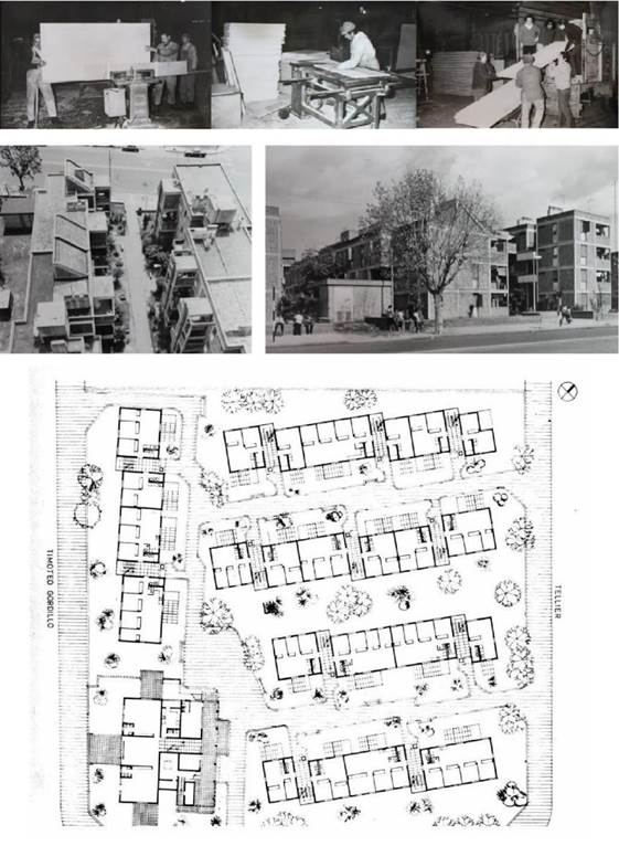En los textos del IIP, se señala que, a pesar de las críticas a la autoconstrucción, debía considerarse una mejora del sistema, para su aplicación desde las políticas de vivienda, debido a que generaba un abaratamiento de los costos y la eliminación de intermediarios en la producción. El Programa de Investigación indagó en la posibilidad de generar formas organizativo-productivas vinculadas a la construcción luego de la materialización de sus viviendas. A estas búsquedas, sumaban la posibilidad de poner en marcha una planta piloto para la producción y experimentación tanto de paneles prefabricados como de dispositivos de cerramiento de vanos. Un espacio de investigación, diseño y construcción de modelos que puedan ser incorporados a futuros planes de vivienda, y que, a la vez, sirva para la capacitación técnica de los usuarios potenciales de las viviendas. Estas iniciativas propuestas por el Programa se vincularon a la reconocida experiencia del realojamiento de la Villa 7 y construcción del Barrio Justo Suárez (Figura 9) (Barrios, 2011; Massida, 2017) impulsada desde un equipo de la Comisión Municipal de la Vivienda (CMV). Formaron parte de dicho equipo compañeros cercanos a Estrella y Tempone, algunos de ellos involucrados directamente con las experiencias de la FAU-UBA, lo que a la vez motorizó trabajos en conjunto entre la CMV y el IIP (Nuestra Arquitectura, 1974).