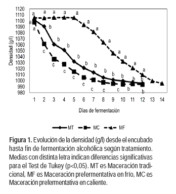 Luego del tratamiento térmico en caliente, los mostos MC presentaron una cinética de fermentación acelerada respecto a los de MT, obteniendo una densidad inferior a 1000 g/l a los siete días de iniciada la fermentación alcohólica. Con temperaturas superiores a los 40 °C, las poblaciones de bacterias lácticas y acéticas, así como de levaduras, desaparecen (Ribéreau-Gayon et al., 1998). La extracción de factores de crecimiento durante el calentamiento favorece el desarrollo posterior de las levaduras inoculadas (Hidalgo, 2003), lo cual explica los resultados obtenidos para este tratamiento.
