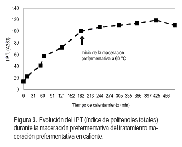 Los mostos MC mostraron los mayores valores de polifenoles totales durante la maceración fermentativa (Figura 2). Durante el tratamiento térmico se observó un aumento brusco en la extracción de polifenoles a medida que aumentaba la temperatura del mosto hasta alcanzar los 60 °C (Figura 3). En las seis horas de maceración a 60 ºC, el contenido de polifenoles totales aumentó, pero en menor proporción respecto a la primera etapa, estabilizándose hacia la última hora de maceración prefermentativa. Varios autores han reportado que el calentamiento del mosto por encima de los 40 °C incrementa la extracción de los compuestos fenólicos de la uva (Boulet, 2003). Escudier et al. (2008) plantean que dichas sustancias también disminuyen durante la fermentación alcohólica, resultando los vinos al final de la misma con un contenido superior (20-40%) respecto a una vinificación tradicional. En esta investigación no se observó una disminución del índice de polifenoles totales durante la maceración fermentativa; el contenido de polifenoles totales se mantuvo estable durante esta etapa. Cuando se realiza esta técnica de extracción no hay alcohol presente en el medio, por tanto se esperan resultados positivos en el contenido de antocianos, en tanto que el efecto sobre el contenido de taninos es más atenuado (Auw et al., 1996; Boulton et al., 2002). Por otra parte, se ha reportado que no existe ganancia suplementaria en la extracción de polifenoles al realizar una maceración prefermentativa en caliente por encima de las siete horas (Cottereau y Desseigne, 2007), resultados que concuerdan con los obtenidos.