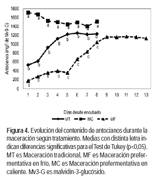La evolución de los contenidos de antocianos en los mostos se observa en la Figura 4. Los mostos MT presentaron una extracción importante de los compuestos en los primeros días, alcanzando una concentración máxima, disminuyendo posteriormente sus contenidos, lo que corresponde a lo mencionado por la bibliografía (Marais, 2003a, 2003b; González-Neves y Ferrer, 2008). Dicha disminución se debe a que los antocianos son oxidados, adsorbidos por las levaduras y microcristales de bitartrato de potasio durante el desarrollo de la fermentación alcohólica, refijados en las partes sólidas de la uva o combinados con otros compuestos presentes en el mosto, tal como es reportado por Ribéreau-Gayon et al. (1998) y Zamora (2003).