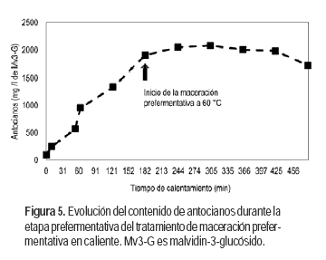 Al inicio de la fermentación alcohólica, los mostos MC, mostraron los mayores contenidos de antocianos respecto a los mostos MT y MF (Figura 4). Si bien se observó una disminución del contenido de antocianos durante la maceración fermentativa, los contenidos fueron significativamente superiores a los obtenidos en los demás tratamientos. El elevado contenido de antocianos al principio de la fermentación alcohólica indica que la extracción de estos compuestos se realizó durante la etapa prefermentativa por efecto de la temperatura. Durante la etapa de calentamiento del mosto y la primera hora de maceración prefermentativa en caliente por encima de 60 °C, se observó un incremento constante en el contenido de antocianos del mosto, manteniéndose durante las restantes cinco horas de tratamiento térmico (Figura 5). Este incremento determinó cambios en el color del mosto, observándose al final de la etapa prefermentativa una elevada intensidad colorante con tonalidades violáceas intensas (datos no presentados). Los resultados obtenidos coinciden con los reportados por varios investigadores, quienes plantean que la máxima extracción de antocianos se obtiene en las primeras horas de la maceración prefermentativa en caliente (Escudier et al., 2008), siendo tres veces mayor al de una fermentación tradicional (Gao et al., 1997) y disminuyendo rápidamente hacia fin de la fermentación. Al descube se observaron contenidos 1,5 veces mayores respecto a la vinificación tradicional (Girard et al., 1997).