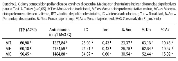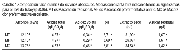 La composición físico-química de los vinos al descube se muestra en el Cuadro 1. Los vinos MC presentaron mayor contenido de alcohol respecto a los vinos MT y MF. Esto se debe a que en la maceración prefermentativa en caliente hay evaporación de compuestos volátiles así como también de agua, lo que puede contribuir a la concentración de los distintos compuestos presentes en el mosto, entre ellos los azúcares, que serán sustrato de las levaduras (Fischer et al., 2000).