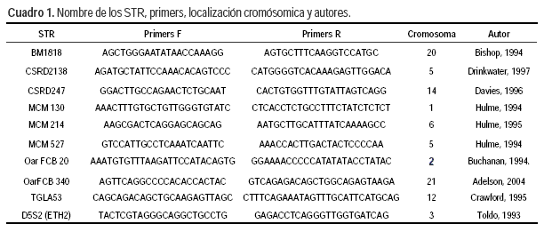Desde 1989 los microsatélites (Short Tandem Repeat: STR) son los marcadores elegidos para estudios a nivel genómico en varios organismos por ser co-dominantes y poseer una alta tasa de mutación (Weber y May, 1989). Esto se refleja en su alto índice polimórfico, fácil genotipado mediante técnicas moleculares (Kelly y Postiglioni, 1997), y en el hecho de que estén ampliamente distribuidos en el genoma ovino (Maddox et al., 2001; Beraldi et al., 2006). También es importante considerar que la mayoría de los microsatélites utilizados en este trabajo son avalados por la Sociedad Internacional de Genética Animal (ISAG). Allí se realiza bianualmente una estandarización de resultados entre varios laboratorios participantes.