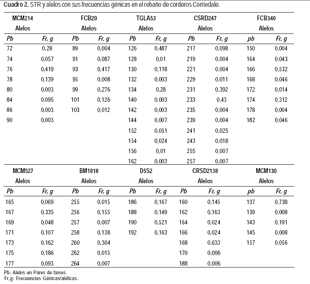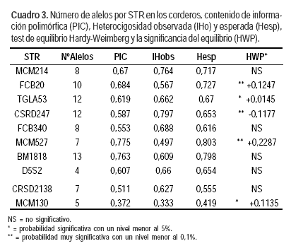 Como se aprecia en el Cuadro 2, el valor de la desviación del equilibrio Hardy-Weinberg fue significativo para cuatro STR (FCB20, CSDR247, MCM527 y TGLA53). Una de las causas podría ser la selección producida por los seis carneros padres aportando pocos alelos con alta frecuencia y a la existencia de un carnero dominante. Esto se detectó a la hora de asignar las relaciones de parentesco, determinando que el 43% de la descendencia corresponde a un solo carnero.