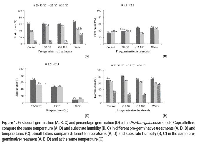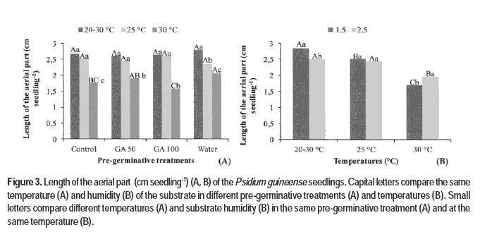 In conclusion, the germination and seedlings growth of Psidium guineense were not affected by pre-germinative treatments. The seeds should be sown at the temperatures of 20-30 or 25 °C, and in moisture substrate of 1.5 or 2.5 times the dried paper mass.