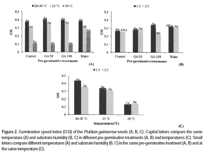 The germination process of Psidium guineense seeds appears to depend more on the temperature ranges between 20 °C and 30 °C and 25 °C than on the pre-germination treatments with GA and substrate moisture. The lower values for measured variables were observed at 30 °C (constant temperature) regardless of the pre-germination treatments, suggesting that the germination of this species is sensitive to high temperatures. The reduction in germination rate at 30 °C, according to Zucareli et al. (2009), may be related to oxygen availability, because at temperatures above 25 °C oxygen is progressively less soluble in water and reaches the embryo in lower quantities. Additionally, high temperatures may trigger responses to thermal stress in the embryo, thus favoring seed deterioration. Although primary root and normal seedlings are formed, the speed of germination and seedling growth are hampered, thereby limiting the area of species establishment and regeneration.