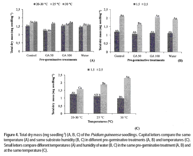 The seedling total dry mass did not significantly differ among the treatments and different substrate humidity, except for the pre-treatment of seeds with 50 mg.L-1 of GA (Figure 4A) at 25 °C and substrate humidity of 1.5 (Figure 3B), which resulted in the lowest mean seedling total dry mass. The seedling total dry mass was the highest in treatments with substrate moisture of 2.5 (Figure 4B, 4C) and incubation temperature of 30 °C (Figure 4C). Thus, the lower substrate moisture highlighted the requirement for mild temperature in order to attain higher translocation of the reserve material to the embryo during the seedling’s growth. Additionally, translocation of the reserve material to the seedlings occurred even at higher substrate moisture (2.5) and the highest temperature (30 °C) (Figure 4C).