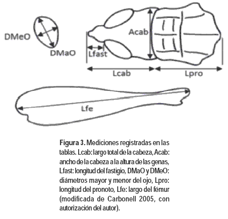 Con el objetivo de complementar la caracterización de los estadios ninfales con caracteres morfométricos y establecer si existen diferencias significativas a este nivel, se evaluaron diferentes medidas corporales: ancho de la cabeza a la altura de las genas, diámetro mayor y menor del ojo, y largo de la cabeza, del fastigio, del pronoto y del fémur posterior derecho (Figura 3). Para ello se tomaron fotos digitales de cada estructura a los efectos de realizar las mediciones correspondientes con el software Image Pro-Express 5. En total se midieron 20 ejemplares (10 de cada sexo) de las todos los estadios ninfales.