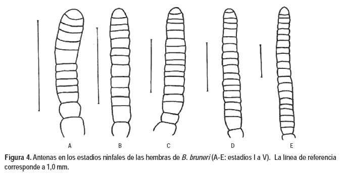 Fueron colectados un total de 1221 individuos pertenecientes a B. bruneri. De acuerdo al análisis de los rudimentos alares, el desarrollo de la genitalia externa y de las antenas, el material colectado fue clasificado en cinco estadios ninfales.