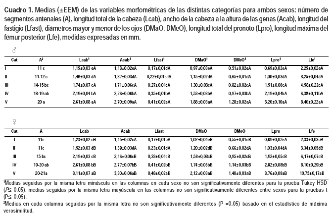 Los resultados de los análisis de las variables consideradas indican que hubo diferencias altamente significativas entre los estadios (antenitos X2 = 28,55; gl = 4; P< 0,0001; largo de la cabeza F 4,90 = 356,49, P< 0,0001; ancho de la cabeza F 4,90 = 435,38, P< 0,0001; largo del fastigio F 4,90 = 128,69, P< 0,0001; diámetro mayor del ojo F 4,90 = 398,47, P< 0,0001; diámetro menor del ojo F 4,90 = 440,80, P< 0,0001; largo del pronoto F 4,90 = 798,80, P< 0,0001; largo del fémur F 4,90 = 845,06, P< 0,0001) y del sexo, con excepción del número de segmentos antenales que no presentó diferencias significativas (X2 = 0,03; gl = 4; P=0,8602), (largo de la cabeza F 4,90 = 89,74, P< 0,0001; ancho de la cabeza F 4,90 = 95,46, P< 0,0001; largo del fastigio F 4,90 = 25,74, P< 0,0001; diámetro mayor del ojo F 4,90 = 89,06, P< 0,0001; diámetro menor del ojo F 4,90 = 47,54, P< 0,0001; largo del pronoto F 4,90 = 798,80, P< 0,0001; largo del fémur F 4,90 = 82,83, P< 0,0001). Con excepción del número de segmentos antenales y de la longitud del fastigio, las restantes variables discriminaron a los cinco estadios dentro de cada sexo, dado que los valores medios registrados en cada una de ellas fueron significativamente diferentes entre sí (Cuadro 1). Al igual que en otras especies de acridios, las hembras fueron más grandes que los machos. Los análisis indican que en todos los estadios ambos sexos fueron diferentes en el largo de la cabeza, el diámetro mayor del ojo y el largo del fémur. Por otro lado las diferencias entre sexos en el ancho de la cabeza y el largo del pronoto se registraron a partir del estadio III (Cuadro 1). Respecto al diámetro menor del ojo, ambos sexos presentaron diferencias significativas en todos los estadios ninfales con excepción del estadio II.