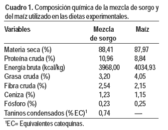 Para realizar los análisis químicos, el maíz, el sorgo y las dietas experimentales fueron molidos con una criba de 3 mm (molino Nogueira® modelo DPM). Las muestras de heces fueron descongeladas y deshidratadas en estufa a 65 °C por un periodo de 72 h, luego de lo cual se procedió a molerlas con criba de 1 mm (molino Cyclotec 1093 Sample Mill®), se homogeneizaron y se tomó una cantidad de 150 g para los análisis. Todas las muestras fueron analizadas en triplicado para la determinación de materia seca (MS), N total de acuerdo a los procedimientos establecidos (AOAC, 1995) y energía bruta (EB) mediante una bomba calorimétrica adiabática (Parr®). Los taninos condensados en la MSO se determinaron mediante el método de hidrocloluro de vainillina-metanol (Price et al., 1978) y se expresaron los valores obtenidos como equivalentes catequinas (EC).