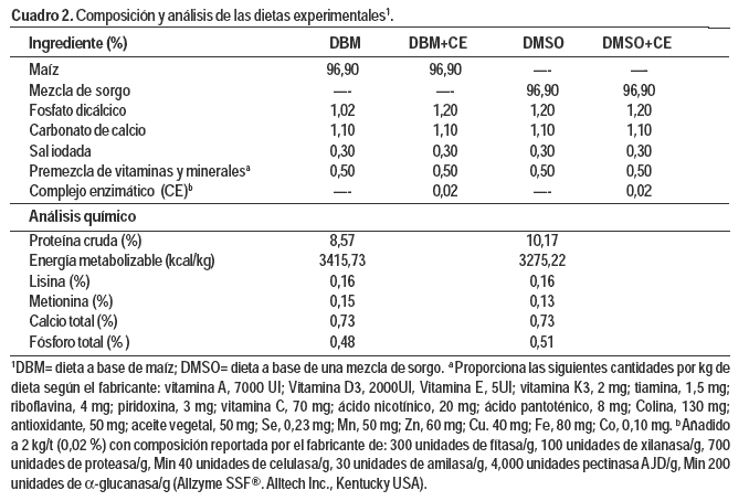Para la preparación de las dietas se dispuso de los granos de la MSO (variedades: Criollo I, Chaguarama III, Himeca 101, Himeca 400) y maíz (Cuadro 1), como principales ingredientes energéticos, y se añadió la premezcla de minerales y vitaminas, para cubrir 100 % de los requerimientos para cerdos en crecimiento (NRC, 1998). Las dietas experimentales (Cuadro 2) se prepararon cinco días antes del inicio de la prueba de digestibilidad. El CE utilizado fue producido mediante fermentación en estado sólido para la ruptura de las cadenas de PNA, con una composición según el fabricante de: 300 unidades de fitasa/g, 100 unidades de xilanasa/g, 700 unidades de proteasa/g, mínimo 40 unidades de celulasa/g, 30 unidades de amilasa/g, 4,000 unidades pectinasa AJD/g, mínimo 200 unidades de a-glucanasa/g. La adición recomendada del CE a las dietas fue en una proporción de 0,02 % (Allzyme SSF®. Alltech Inc., Kentucky USA).