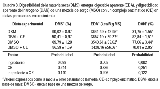 El Cuadro 3 muestra la DMS, EDA y DAN de una MSO con un CE en dietas para cerdos en crecimiento. No se encontraron diferencias para la DMS entre los factores ingrediente y CE de la DBM y DMSO combinadas con CE, ni la interacción de los mismos, con valores promedio de digestibilidad de 90,02 ± 0,97 % y 89,79 ± 1,29 %, para la DBM y DMSO, respectivamente. Respecto a la EDA, el CE o la interacción del ingrediente × CE no produjeron variaciones estadísticas, sin embargo el ingrediente utilizado mostró efecto (P = 0,003) sobre la EDA, la cual fue mayor en la DBM que la DMSO, existiendo una reducción de la energía de 100 kcal/kg MS. Sobre la DAN, se obtuvo respuesta similar a la EDA, no se evidenció efecto del CE ni de su interacción con los ingredientes, no obstante hubo diferencias (P = 0,002) para el tipo de ingrediente, generado la principal diferencia entre los resultados. La DAN fue superior en la DBM respecto a la DMSO, cuya digestibilidad fue 4,69 % menor. Por lo tanto, con dichos resultados de la DMS, EDA y DAN se evidencia las diferencias existentes entre la utilización del maíz y el sorgo como fuente de energía en las dietas.