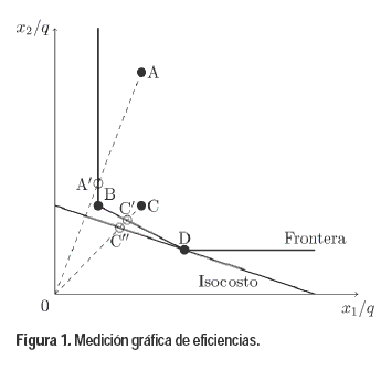 Si consideramos una situación donde las UTD utilizan dos insumos x1 y x2 y los expresamos por unidad de producto q, gráficamente la eficiencia técnica se puede definir como el cociente entre 0A’/0A para la UTD A o por el cociente 0C’/0C para el caso de la UTD C (Figura 1). La eficiencia económica considerada como eficiencia de costos se mide por el cociente entre la distancia 0C’’ y la distancia 0C. La eficiencia de asignación está dada por el cociente 0C’’/0C’. El caso B representa una UTD que es técnicamente eficiente pero presenta ineficiencias económicas básicamente por una ineficiencia en la asignación de factores. El caso D representa una UTD técnica y económicamente eficiente.