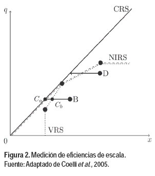 El tipo de ineficiencia de escala se puede representar gráficamente (Figura 2) considerando la frontera con retornos no crecientes a escala. La UTD representada en el punto B se da en una situación donde la frontera que determina ETNIRS es diferente a la que determina ETVRS, por lo tanto los retornos a escala para la UTD B son crecientes. En el caso representado por el punto D los retornos a escala serán decrecientes (Coelli et al., 2005).