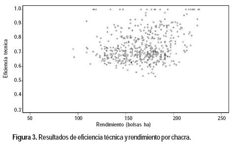 De las 573 chacras hay solo tres que operan en un nivel eficiente si miramos la eficiencia económica. Aquí vale recordar que la unidad de análisis es la chacra cuando el productor habitualmente maneja varias chacras. De todos modos, el número de chacras eficientes a nivel económico es bajo y muestra que la asignación de recursos no es la mejor, aun cuando por falta de datos no se incluyeron factores representativos del capital físico y mano de obra.