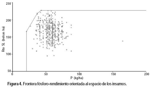 Gráficamente y a modo de ejemplo, la frontera entre rendimiento y cantidad de fósforo utilizado muestra tres UTD conformando la frontera (Figura 4). La misma está construida bajo el supuesto de rendimientos variables a escala. La distancia horizontal entre un punto y la frontera representa el nivel de ineficiencia de la chacra representada en el uso de este insumo.