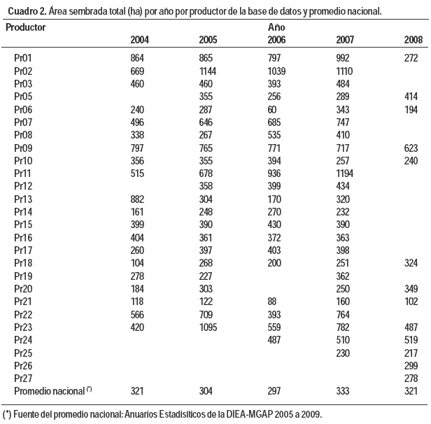 El resultado de rendimiento en kilogramos por hectárea presentado en el Cuadro 1 muestra que son productores con chacras que se ubican por encima del rendimiento promedio nacional, el cual en la zafra 2004/05 fue de 6600 kg ha-1, en 2005/06 de 7300 kg ha-1, en 2006/07 y 2007/08 de 7900 kg ha-1, y en 2008/09 de 8000 kg ha-1. El área sembrada por productor (Cuadro 2) muestra una variación importante dentro del grupo, habiendo productores pequeños en relación a la media nacional y otros que se encuentran por encima de la misma. El otro dato que se desprende del Cuadro 2 es que la base de datos no es balanceada al no contar con datos para todos los productores en todos los años. De todos modos no se cuenta con una identificación clara por chacra que permita hacer un seguimiento a ese nivel.