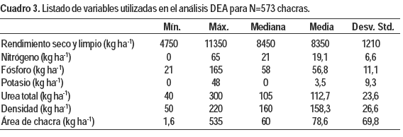La metodología Análisis Envolvente de Datos (DEA, por su sigla en inglés) fue presentada originalmente por Farrell (1957), pero hasta el trabajo de Charnes et al. (1978) no se identificó como tal. La metodología DEA es un enfoque no paramétrico que utiliza programación lineal para determinar eficiencia entre Unidades Tomadoras de Decisión (UTD). Este trabajo utiliza la metodología DEA y sigue en parte el trabajo de Watkins et al. (2014)1, en el quese estudia la eficiencia de producción utilizando registros de chacras de arroz por el programa de extensión de la Universidad de Arkansas.