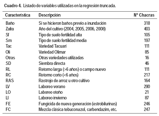 La primera variable incluida en la regresión es la realización de baños o no previo a la inundación de la chacra. Es una práctica que influye en la germinación y emergencia y presente en el 55 % de los casos. Luego se incluye una variable que incorpora las zafras de forma que el modelo recoja el efecto año. Esta variable es continua, asignando valores ordinales a cada año en particular. Hay tres tipos de suelo identificados por su fertilidad natural, pobre, media y fértil. Se generaron dos «dummy» para suelos de fertilidad alta y media. Las variedades utilizadas también se incluyen en el análisis para determinar si tiene impacto sobre los registros de eficiencia. Se generaron cuatro variables «dummy» para las variedades: ‘Coronilla’, ‘Olimar’, ‘Tacuarí’ y ‘otras’, quedando ‘El Paso 144’ excluida del análisis. Hay dos tipos de siembra identificados en la base de datos, convencional y directa. En la regresión se incluyó una variable identificando las chacras bajo siembra directa. La historia de chacra tiene cuatro categorías de las cuales se incluyen tres, retorno de más de seis años o campo nuevo, retorno de menos de seis años y rastrojo de arroz; se deja fuera chacras que se siembran con un año intermedio entre cultivos. El laboreo es agrupado por estación del año, se incluyen en la regresión laboreos de verano, otoño e invierno, dejando fuera los laboreos de primavera. La última variable incorporada a la regresión considera la utilización de funguicida. Se consideraron dos categorías, convencionales y nuevas mezclas (estrobilurinas), dejando fuera del análisis las chacras sin aplicación.