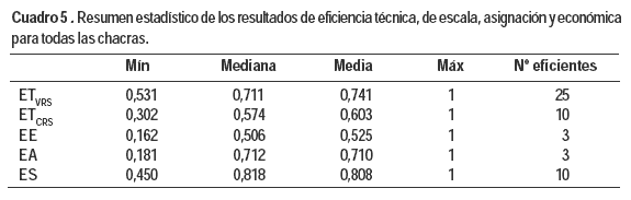 Los resultados de ET muestran que hay 25 chacras que definen la frontera de producción y que el promedio de las chacras tiene un nivel de eficiencia de 74 % respecto de las eficientes. Esto considerando rendimiento de escala variable. Si se considera la ET con rendimientos constantes, el número de chacras eficientes se reduce a 10. Esto muestra que hay 14 firmas que presentan una ineficiencia de escala y no ineficiencia técnica pura. Las chacras que definen la frontera no presentan un rendimiento promedio mayor a las que se encuentran en el rango de ET de 0,8 a 1, ni difieren estadísticamente en el uso de insumos respecto de estas. Sí hay un corte claro en rendimiento y uso de insumos entre las que presentan valores menores a 0,8 y aquellas que presentan ET ≥8.