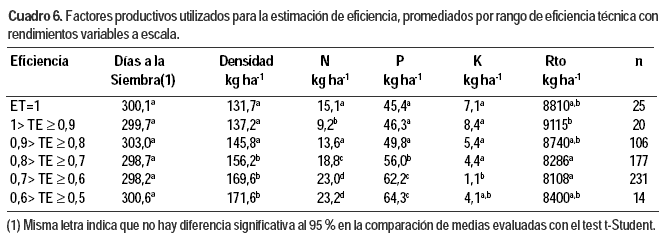 El resultado de ET agrupado por rangos de eficiencia (Cuadro 6) muestra que en promedio las chacras más eficientes no presentan diferencias significativas en días julianos a la siembra. Si se considera densidad de siembra en kg ha-1 las chacras más eficientes, aquellas con indicadores por arriba de 0,8, utilizan menos cantidad de semilla por hectárea que las menos eficientes. El uso de fertilizantes muestra que las chacras más eficientes tienden a utilizar menor cantidad de nitrógeno a la siembra y fósforo y mayor cantidad de potasio. Esto indica que chacras más eficientes tienen un manejo más ajustado de la fertilización, ya que se usan menos cantidades de los nutrientes más comunes y mayor cantidad de potasio cuyo uso es menos frecuente. En cuanto al rendimiento se aprecia que si bien entre las chacras eficientes y aquellas que conforman los dos rangos siguientes de eficiencia no hay diferencias significativas, las que conforman el grupo que define la frontera no llegan a los máximos rendimientos y no son tampoco estadísticamente diferentes en promedio que las de menor eficiencia. Si bien la aplicación de nitrógeno post-siembra (urea) no se reporta en el Cuadro 6, el resultado muestra que el único rango estadísticamente diferente es el de menor eficiencia.