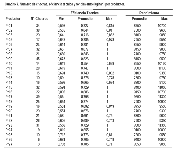 Agrupando los resultados de eficiencia técnica por productor, se observa que hay 12 de 26 productores que tienen al menos una chacra definiendo la frontera de producción (Cuadro 7). Analizando los resultados por ET se observa que hay productores que logran ET promedio superiores a los máximos registros de ET que logran otros (Pr16). Hay algunos productores que aun logrando rendimientos de más de 10000 kg ha-1 presentan resultados de ET máxima relativamente bajos (por ejemplo, Pr10 y Pr26). Esto indica que hay productores que logran un alto rendimiento en base a un uso de insumos muy elevado, que aparecen como buenos productores si solo miramos la productividad parcial (rendimiento), cuando en realidad el desempeño global no es bueno si se consideran todos los factores. Lo que se aprecia en el Cuadro 7 es que el productor tiene incidencia en los resultados por ser quien toma las decisiones a nivel de empresa.