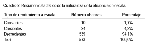 El análisis de la eficiencia de escala muestra que hay 10 chacras que operan a rendimientos constantes, 539 con rendimientos decrecientes y 24 que operan en una región de rendimientos crecientes. Es decir que la mayoría se encuentra operando en una región económicamente racional. Las 24 chacras que presentan un rendimiento creciente a escala podrían incrementar la producción aumentando la escala hasta alcanzar rendimientos constantes y reducir costos unitarios.