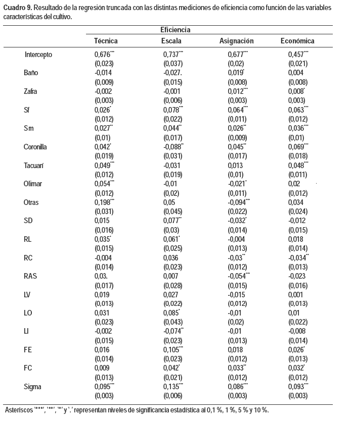 El resultado de la regresión truncada para la ETVRS se muestra en el Cuadro 9. El intercepto expresa el efecto de las variables omitidas en la regresión. El efecto del baño pre inundación no tiene efecto significativo sobre la eficiencia técnica ni económica, pero sí tiene un efecto positivo sobre la eficiencia de escala y de asignación. El signo negativo del baño de chacra sobre la ES indica que aquellos que lo aplicaron incrementaron la ineficiencia de escala. La variable zafra, que es continua para los años 2004-06 y 2008, presenta efectos significativos sobre la eficiencia de asignación y económica. Quiere decir que presentado de esta manera el efecto año no influye sobre la eficiencia técnica, pero sí permite explicar parte de la ineficiencia de asignación y económica como resultado del año.