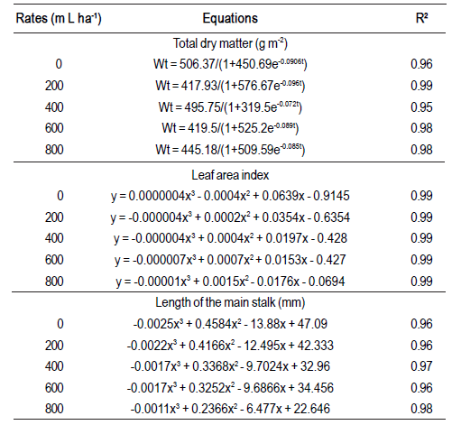 Table 1 Equations related to data of the total dry matter, leaf area index and length of the main stalk of wheat produced under fertilization for high productivity and rates of the growth regulator. Capão do Leão, Brazil, 2015.