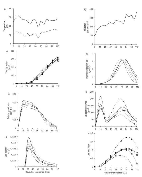 Figure 1 Maximum ( ) and minimum temperatures ( ) (a), solar radiation (b), total dry matter (c), dry matter production rate (d), relative growth rate (e), net assimilation rate (f), leaf area ratio (g) and leaf area index (h) of wheat plants (Triticum aestivum L.) subjected to rates of application of the growth regulator trinexapac-ethyl. Where T1 = noapplication ( ), T2 = 200 mL ha-1 (- - - -), T3 = 400 mL ha-1 (- - - - -), T4 = 600 mL ha-1 (·········) and T5 = 800 mL ha-1 (- · - ). Capão do Leão, Brazil, 2015.