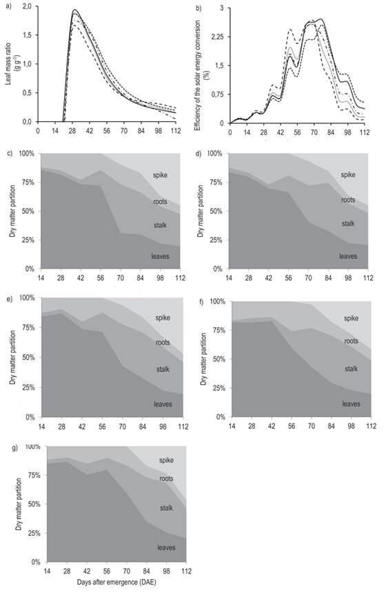 Figure 2 Leaf mass ratio (a), efficiency of the solar energy conversion (b) of wheat plants (Triticum aestivum L.) exposed to the application of trinexapac-ethyl, where: T1 = no application ( ), T2 = 200 mL ha-1 (- - - -), T3 = 400 mL ha-1 (- - - -), T4 = 600 mL ha-1 (·····) and T5 = 800 mL ha-1 (- · -). And the dry matter partition in different structures of the wheat plants (Triticum aestivum L.) exposed to the application of trinexapac-ethyl, where T1 = no application (c). T2 = 200 mL ha-1 (d), T3 = 400 mL ha-1 (e), T4 = 600 mL ha-1 (f) and T5 = 800 mL ha-1 (g). Capão do Leão, Brazil, 2015.