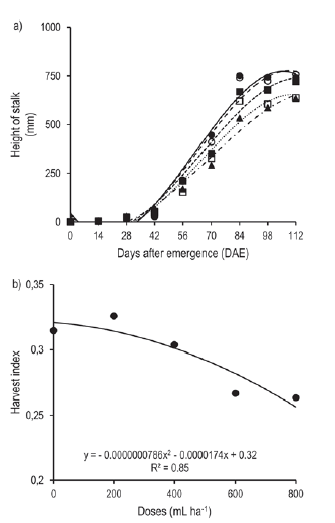 Figure 3 Height of stalk (a), where T1 ( ), T2 (- - -), T3 (- - -), T4 (· · · ·) and T5 (- · -), and harvest index (b), of wheat plants (Triticum aestivum L.) subjected to rates of the application of the growth regulator trinexapac-ethyl. Capão do Leão, Brazil, 2015.
