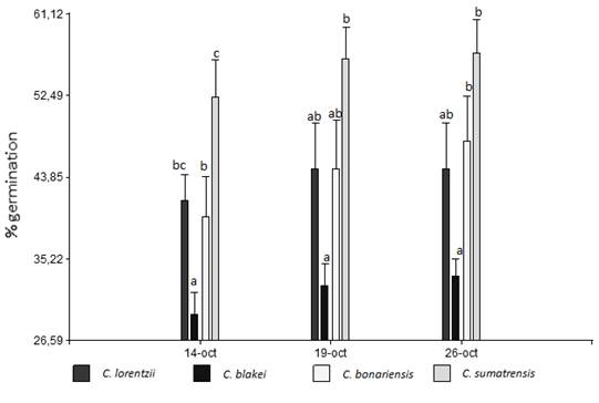 Figure 1: Germination percentage of Conyza lorentzii, C. blakei, C. bonariensis and C. sumatrensis under controlled conditions (for each sample date equal letters indicate non-significant differences according to the lsd test (α= 0.05)). Vertical bars represent the standard error of the mean.